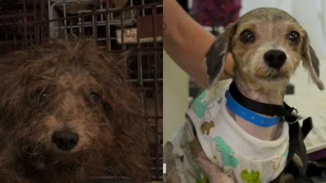 This described several Dogs matted with feces-covered fur before Humane World for Animals’ rescue.